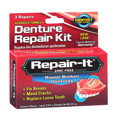 Repair Broken Dentures Quickly and Inexpensively! The Dentemp Repair-it Denture Care Kit contains everything you need to fix breaks, mend cracks and replace loose teeth in minutes. The safe and easy to use kit is zinc free and a must-have for anyone with dentures.