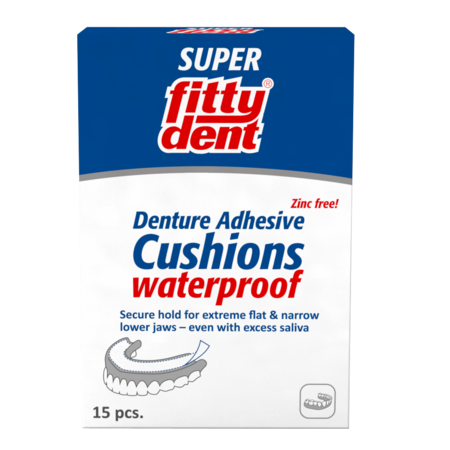 SECURE / Fittydent super Denture Adhesive Cushions are waterproof and assure a secure, strong bond between the lower denture and gum even in the most difficult cases