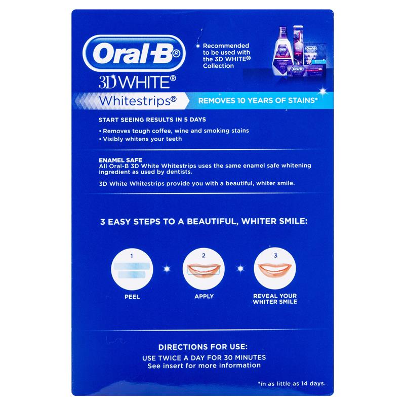 Achieve a brighter, more radiant smile with Oral-B 3D White Whitestrips. In just 14 days, these whitestrips can remove up to 10 years of stains, including tough coffee, wine, and smoking stains. You'll start seeing results in as little as 5 days, revealing a visibly whiter smile.