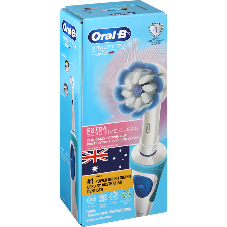 The Oral-B Vitality Sensitive rechargeable electric toothbrush features a compact, round brush head that surrounds each tooth with extra soft bristles to gently clean teeth and gums better than a regular flat trim manual brush.