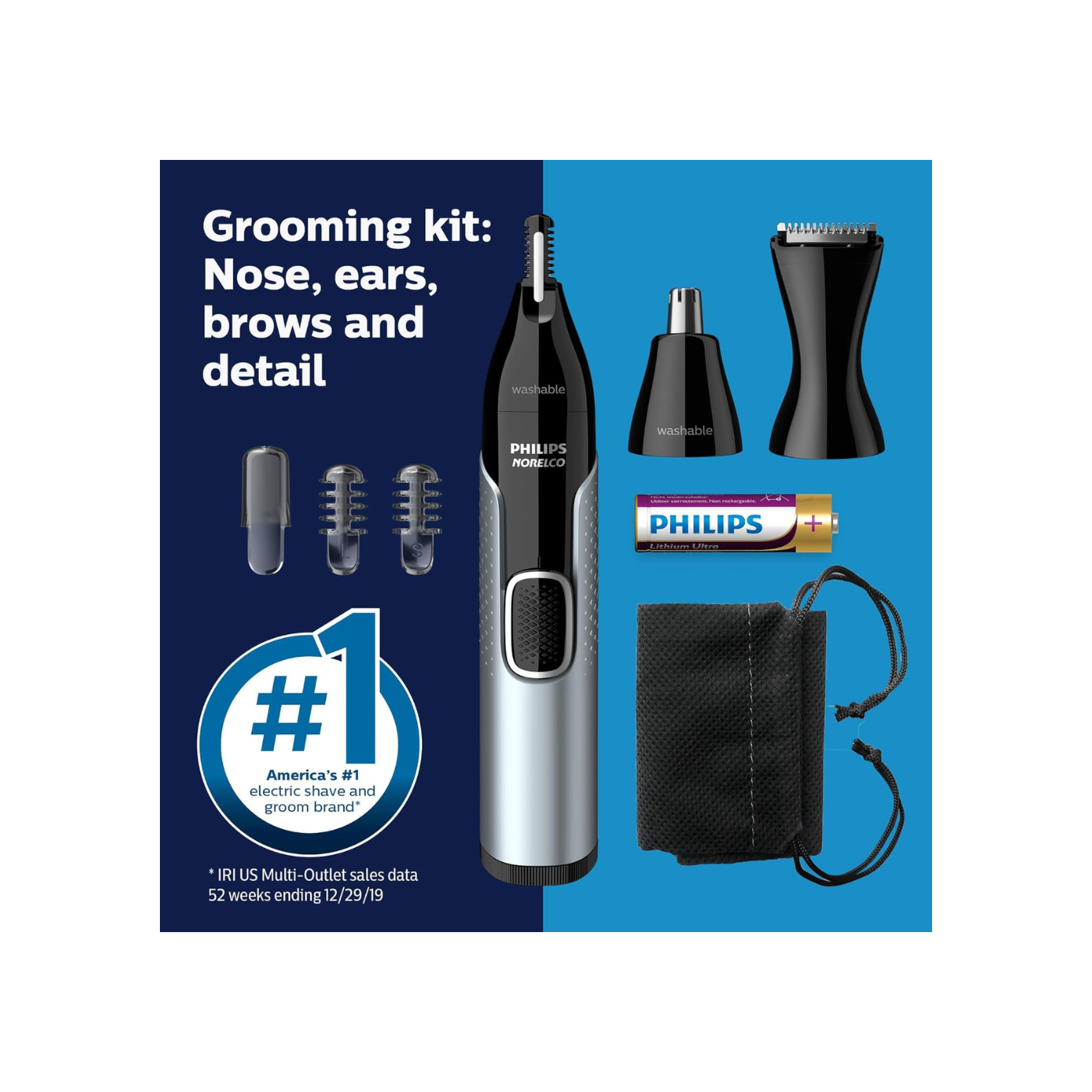 The Philips Norelco NOSETRIMMER 5000 with ProtecTube technology gently removes nose, ears and eyebrow hairs. The detail trimmer with DualCut technology ensures a fast, precise efficient trim of the neck ling, sideburns and beard.