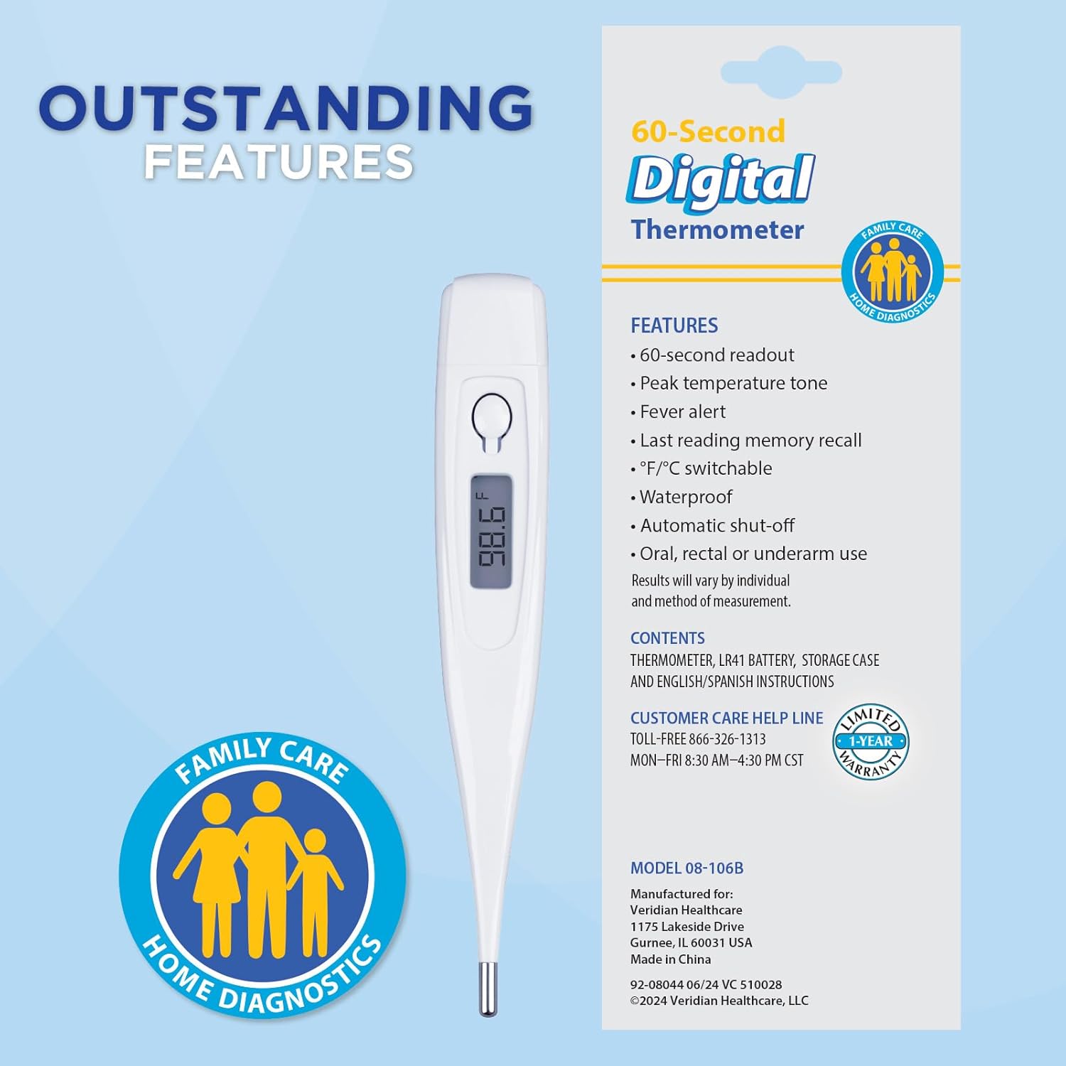 • Includes: Thermometer, 2-piece storage case, replaceable LR41 battery and detailed English/Spanish instructions